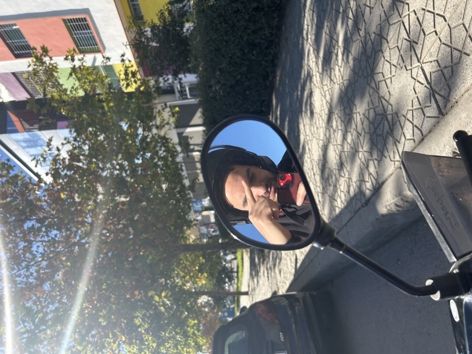 The image captures a bright daytime street scene in Fez, Morocco, viewed from the perspective of a motorcycle. The central focus is the reflection of a male individual in an oval motorcycle rearview mirror. This individual wears a black helmet with the visor raised, and is holding a red smartphone in his left hand, positioned to photograph his own reflection. His right index finger is extended horizontally across his forehead. The mirror reflects a clear blue sky behind his head. In the immediate foreground, a portion of the motorcycle's handlebar and the mirror arm are visible. The ground consists of light-colored concrete pavement adorned with an intricate repeating geometric star pattern, bordered by a gray concrete curb. Beyond the curb, an asphalt road extends. To the left of the scene, a black Peugeot 207 sedan is parked on the street, facing away from the viewer. The background features several deciduous trees displaying green and some yellowish-brown foliage, suggesting an autumn season or specific tree type. On the right side of the background, a multi-story building is prominent, characterized by a facade segmented into horizontal bands of vibrant colors, including orange, yellow, green, pink, and blue, with windows featuring horizontal grilles. Sunlight is intense, creating a strong lens flare in the upper left portion of the image and casting distinct shadows on the patterned pavement.