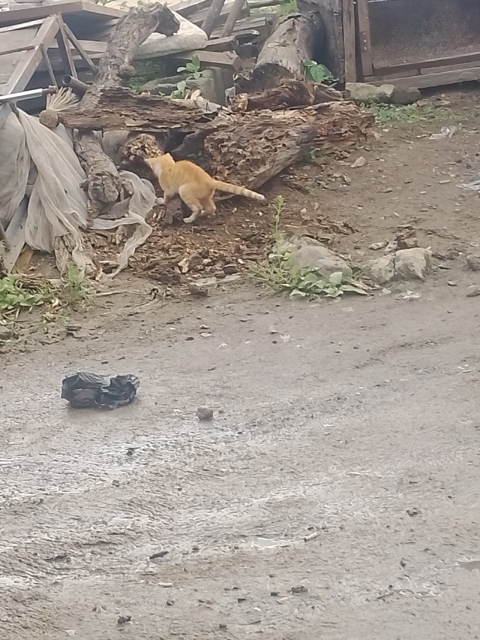 The scene depicts an unpaved outdoor area in Adankolo, Nigeria. The foreground consists of damp, uneven earth with visible textured patterns, featuring a crumpled black object resembling a plastic bag on the left and a small dark stone further right. In the midground, an orange domestic cat is positioned on top of a pile of weathered logs and wood debris, facing right. White, translucent plastic sheeting is draped over the debris on the far left. Scattered green foliage grows amidst the debris and on the surrounding ground. Two small, light-colored felines, likely kittens, are visible peering from within the log pile in the background. Additional wooden structures and a section of a metal grate or gate are present in the far background.