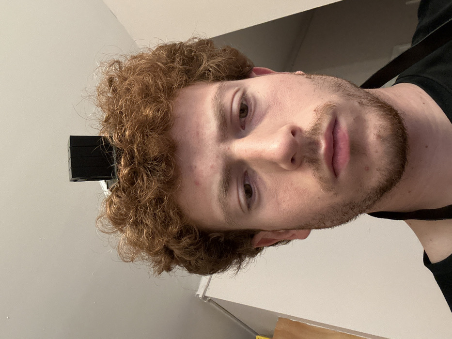 A fair-skinned man with reddish-brown curly hair and a trimmed beard faces forward. His eyes are brown, and his lips are full. He wears a black shirt visible at the right. A black, rectangular object appears near his left temple. The background includes a light gray wall and hints of furniture. The image is slightly rotated counter-clockwise.