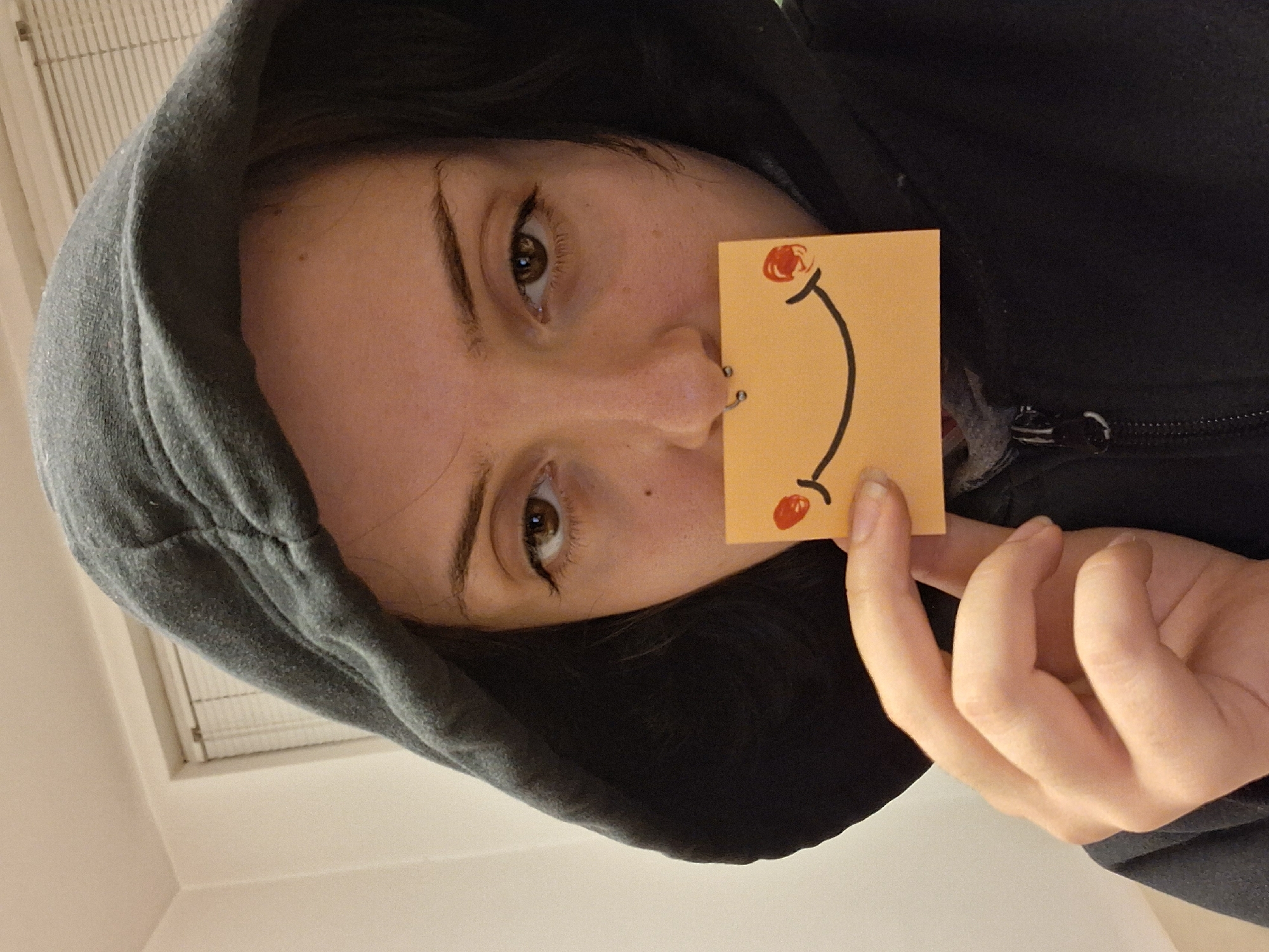 - "A person with brown eyes, dark hair, and a hooded sweatshirt holds an orange sticky note with a drawing of a smiling face near their nose" by FM-swuGF2, licensed under CC BY 4.0