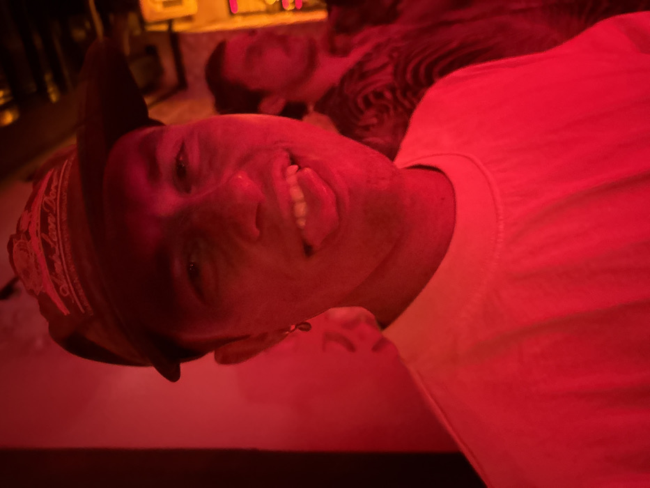A person with fair skin smiles broadly in a red-lit setting. They are wearing a white shirt and a bandana on their head. A second person lies horizontally in the background, slightly out of focus and partially obscured. The lighting creates a strong red hue across the scene, impacting the clarity of details. The image appears to be shot at close range, with the primary subject’s face angled towards the viewer.
