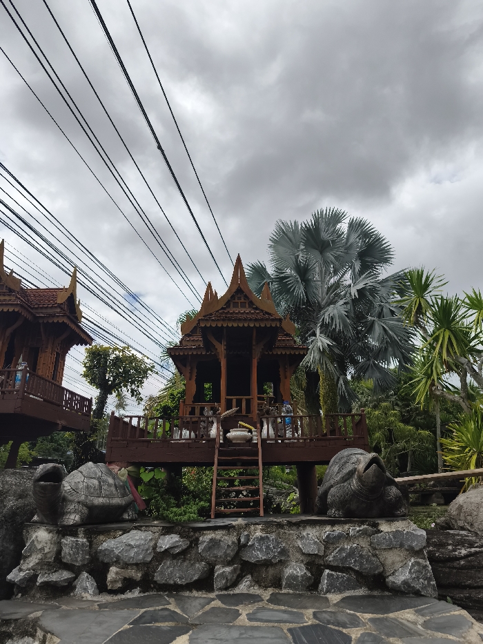 A wooden spirit house, in the traditional Thai style, sits elevated on a platform between two large turtle sculptures. The structure has an intricate roof and is accessed by a small ladder. Another spirit house is visible to the left. Lush greenery and palm trees surround the shrine. Overhanging power lines crisscross above, contrasting with the cloudy sky. The shrine rests on a rock base with a tiled ground in front.