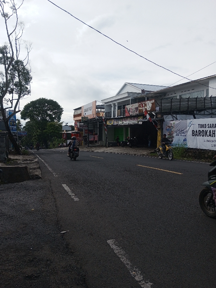 A street scene depicts motorbikes in motion and parked along a commercial area. Buildings with signs like "ELEKTRONIK" and "TOKO SARANA BAROKAH" line the road. The road itself is marked with dashed white lines. A tree stands to the left, its branches partially bare. The sky above is overcast, and an overhead wire spans the view.
