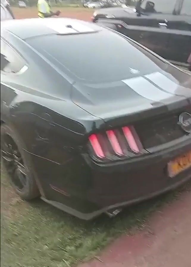 black Ford Mustang parked on grass in front of a building with people on the balcony. The car has grey stripes running along the hood and roof. The license plate reads “KDV 115L”. People are walking around the car and near the building, some looking at it. A black SUV is parked next to the Mustang. The ground is a mixture of grass and bare earth.
