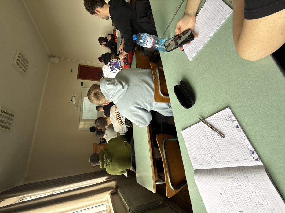The image depicts the interior of a classroom in Varna, Bulgaria, during what appears to be a lecture or lesson
