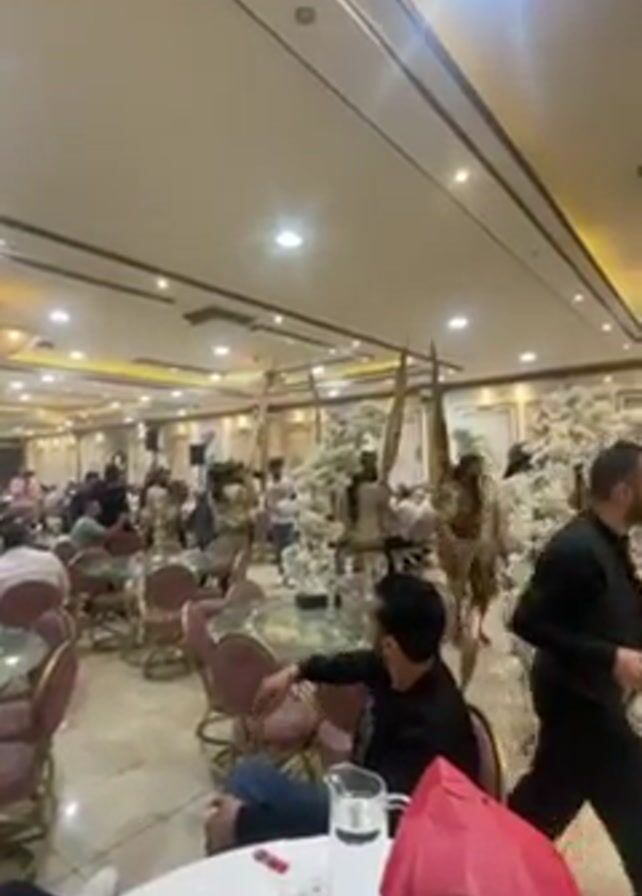 large banquet hall, decorated with white floral centerpieces and furnished with round tables and mauve chairs. Several people wearing what appear to be military-style uniforms and carrying flags walk through the room amidst seated guests. The hall has a high ceiling with recessed lighting and a decorative chandelier. A person at a table in the foreground is holding a cell phone, recording the event. A cooler, glasses and a red bag sit on the table in front of them.