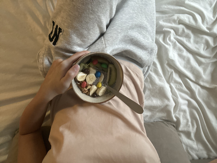 An overhead shot shows an individual in a bed within a residence in Vanves, France. The person wears a light pink t-shirt and grey sweatpants, which feature a dark "NY" logo patch on the right thigh. The individual's left hand supports a ceramic bowl containing a dark-colored base, topped with sliced bananas, chopped kiwi, walnuts, and multi-colored candy-coated chocolates in yellow, red, blue, green, and brown. A silver spoon is inserted into the bowl. The bed is covered with wrinkled white sheets, and a grey pillow is partially visible in the upper left of the frame.