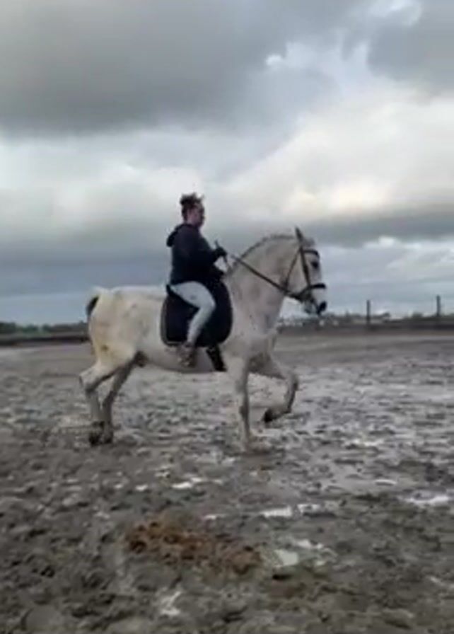 A woman rides a white horse in a muddy paddock