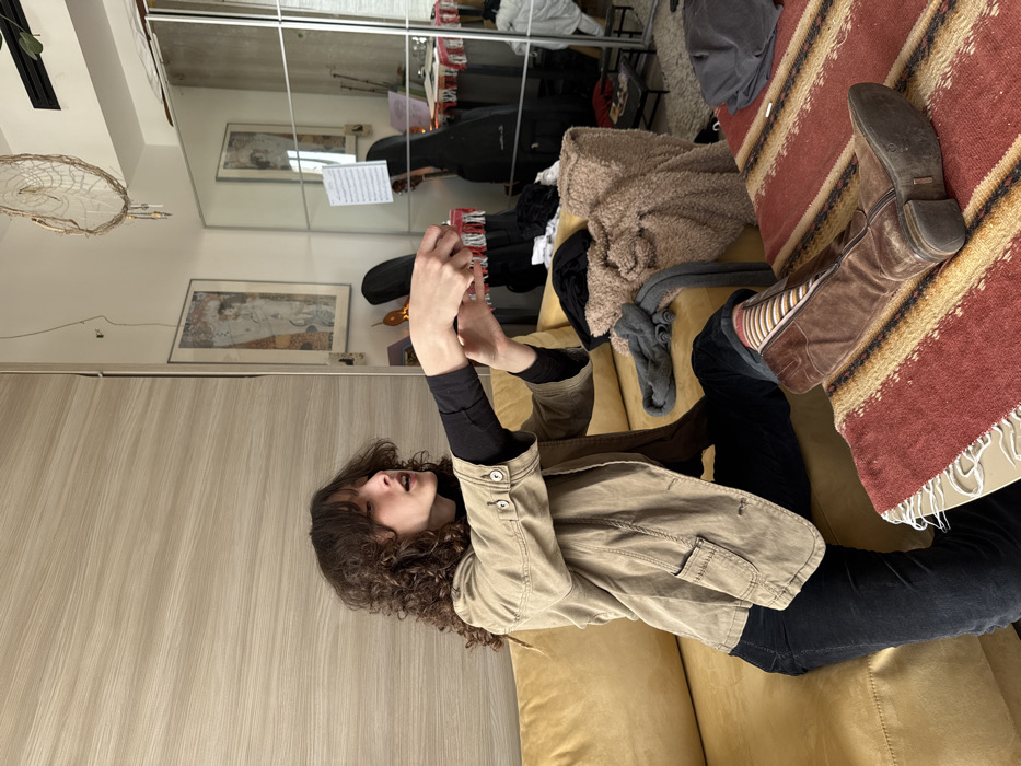 The image depicts an indoor residential scene in the city of Or Akiva, Israel. A young individual with dark, curly hair and an open mouth is seated on a mustard-yellow sofa, extending their arms forward to hold a small, light-colored object with both hands. They are wearing a beige casual jacket over a black long-sleeved shirt and dark pants. Their right leg is bent with a striped sock visible, while their left leg is extended. A brown, knee-high boot rests on its side on a low table in the foreground, which is covered by a red and beige patterned textile. Behind the individual, a light-toned wooden paneled wall is visible. To the right, a large, multi-paneled mirrored wardrobe reflects parts of the room. These reflections show a framed artwork on a wall, a white dreamcatcher hanging from the ceiling, a piece of sheet music taped to a mirror panel, a black instrument case (possibly a cello or guitar case), and various clothing items and other objects scattered on surfaces. A pile of grey and brown clothing items is also on the sofa next to the seated individual.