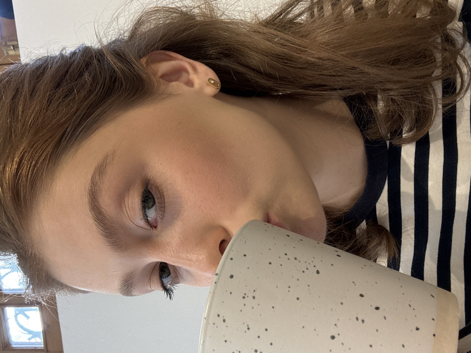 A young woman is angled toward the camera, her head tilted, with a cup partially obscuring her lower face. She has fair skin, light brown hair, and a subtle gold earring. Her eyes are light-colored and gaze upward. She wears a striped top. A window can be seen in the background with light streaming in. The cup is a speckled white color.