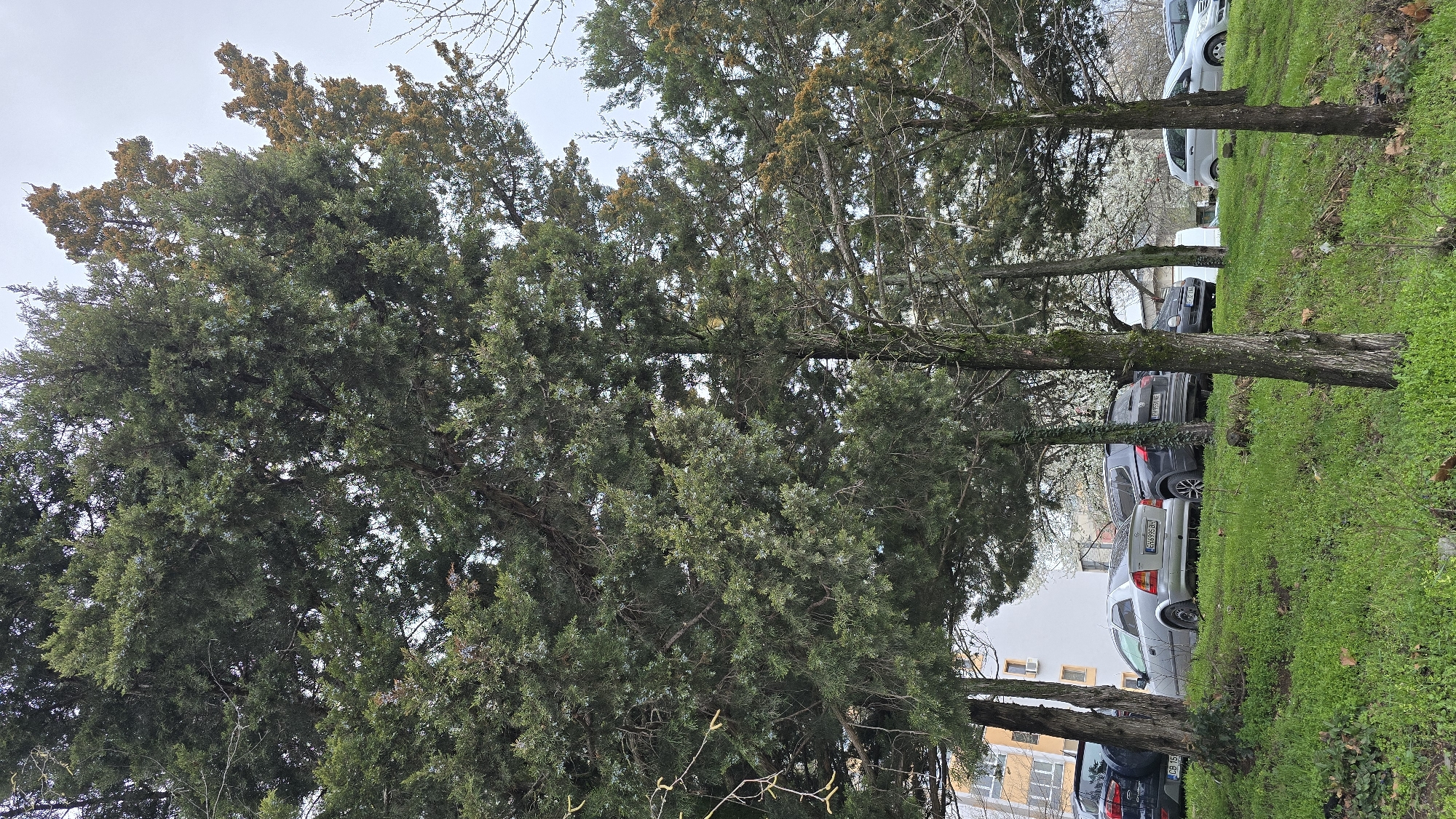The image presents an outdoor scene in what appears to be a residential area in Pleven, Bulgaria. Several tall evergreen trees dominate the left side of the frame. Their foliage is primarily green, with some sections exhibiting brownish coloration. A row of parked cars is visible along the right side of the image, partially obscured by the trees. License plates indicate Bulgarian registration. A grassy area covers the ground to the right of the vehicles. In the background, a building with windows can be seen, and the sky is overcast. No people are visible in the shot.