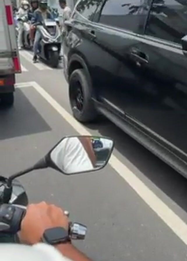 first-person perspective from a motorcycle in traffic. The rider wears a white shirt and a smartwatch. A black SUV with custom wheels is beside the motorcycle. Several other motorcycles are visible, some carrying multiple passengers. The setting appears to be an urban street with buildings lining the side and crosswalks painted on the road. The vehicles are stationary, indicating a traffic jam.