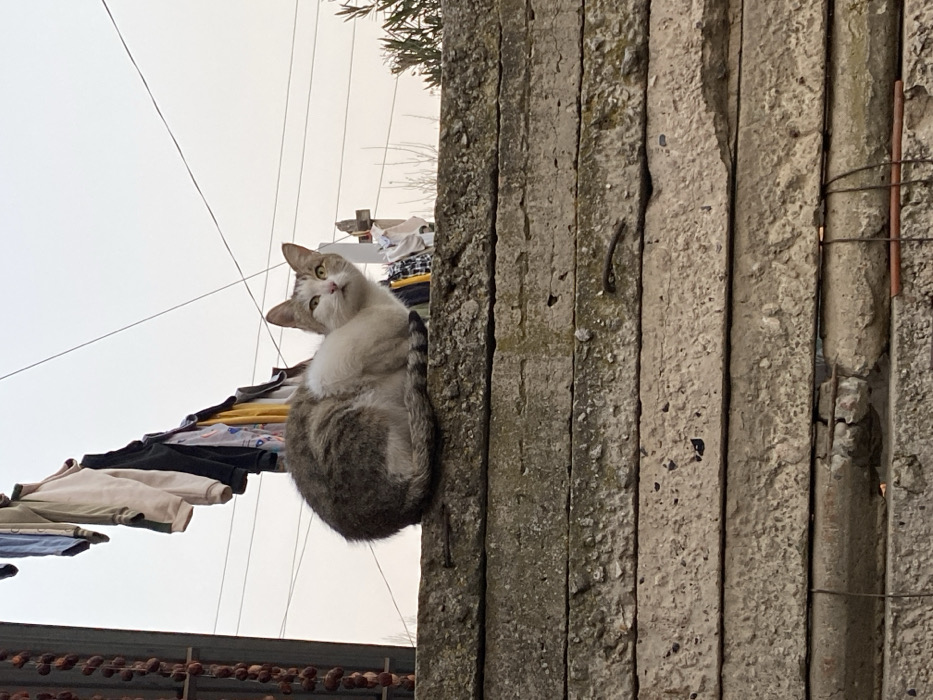In Debetavan, Armenia, a domestic short-haired cat, with a tabby and white coat, is positioned atop a weathered concrete wall constructed from stacked horizontal slabs. The cat is seated, facing slightly to the left with its yellowish-green eyes directed upwards. In the upper left background, various items of laundry are suspended on a clothesline. The background also includes sparse, bare tree branches and utility wires against a light, overcast sky.