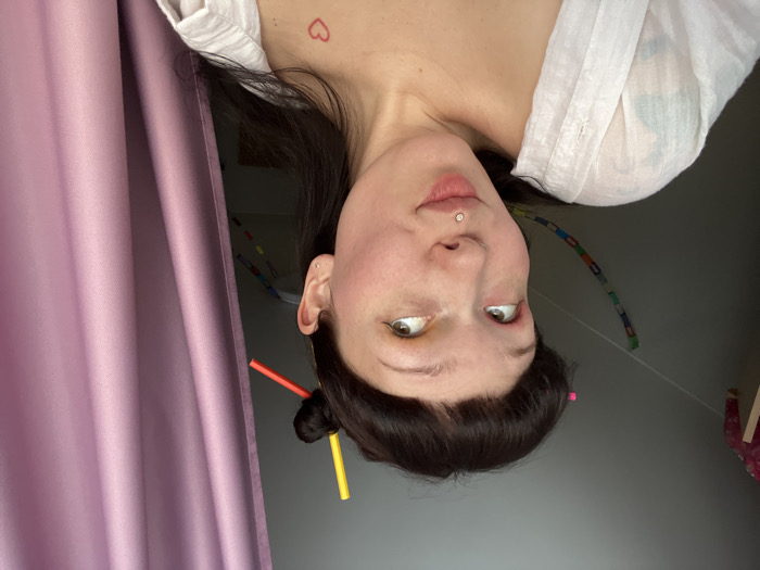 A medium close-up portrait depicts a young adult female indoors in Chaikovsky, Russia. The subject has dark brown hair with blunt bangs; a bun on the back of her head is secured by a yellow and a red plastic straw. She possesses a labret piercing with a silver stud below her lower lip and a small silver stud earring in her left earlobe. Her left eyelid displays pink eyeshadow, while her right eyelid features yellow eyeshadow. A small, red outlined heart tattoo is visible on her upper right chest. She wears an unbuttoned, loose-fitting white shirt, partially revealing her shoulder and chest. Her head is tilted, and her gaze is directed upwards and to her right, with a slight smirk on her lips. The background on the left consists of a dark gray wall, featuring a multicolored, segmented decoration strung horizontally and a light-colored wooden structure in the upper corner. The right side of the background is occupied by a smooth, pink pleated curtain.