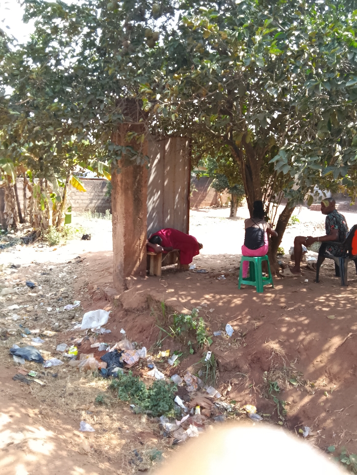 The scene depicts an outdoor gathering area in Ukwu-Abwa, Nigeria, characterized by a reddish-brown dirt ground with significant litter, including plastic bags and wrappers, scattered in the foreground and to the left