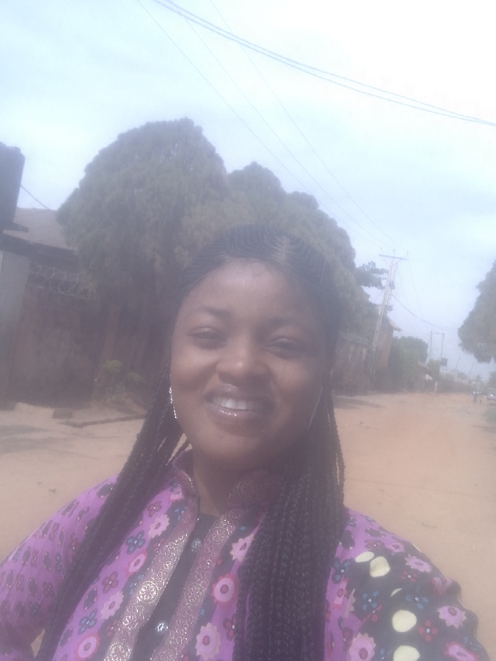 The image depicts an outdoor, waist-up portrait of an adult female in an unspecified location within the city of Unknown, Unknown. The subject, a female with dark skin and black braided hair, is smiling broadly at the camera, revealing white teeth. She is wearing a purple garment featuring a floral pattern in shades of pink, black, white, and yellow/gold, with a gold-colored decorative trim down the front. Long, thin, silver-colored dangle earrings are visible. The background reveals a dirt or unpaved road extending into the distance. To the left, a large, dense green tree is prominent, partially obscuring a building with a dark roof and a fence topped with barbed wire. To the right, utility poles supporting overhead power lines are present, receding into the background. The sky is overcast, appearing light gray. The scene is illuminated by natural daylight.