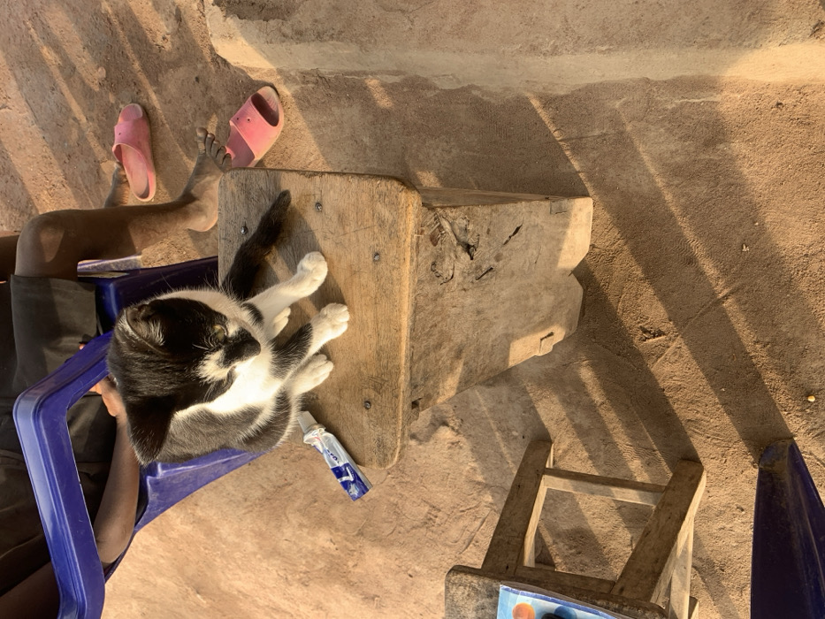 A person sits in a blue plastic chair, pink sandals nearby. A black and white cat lies on a wooden stool next to them, with a tube of ointment visible. The scene is outdoors, with sunlight casting shadows on the ground and a smaller, unfinished wooden stool nearby. The surface is uneven and appears to be a mix of dirt and concrete.