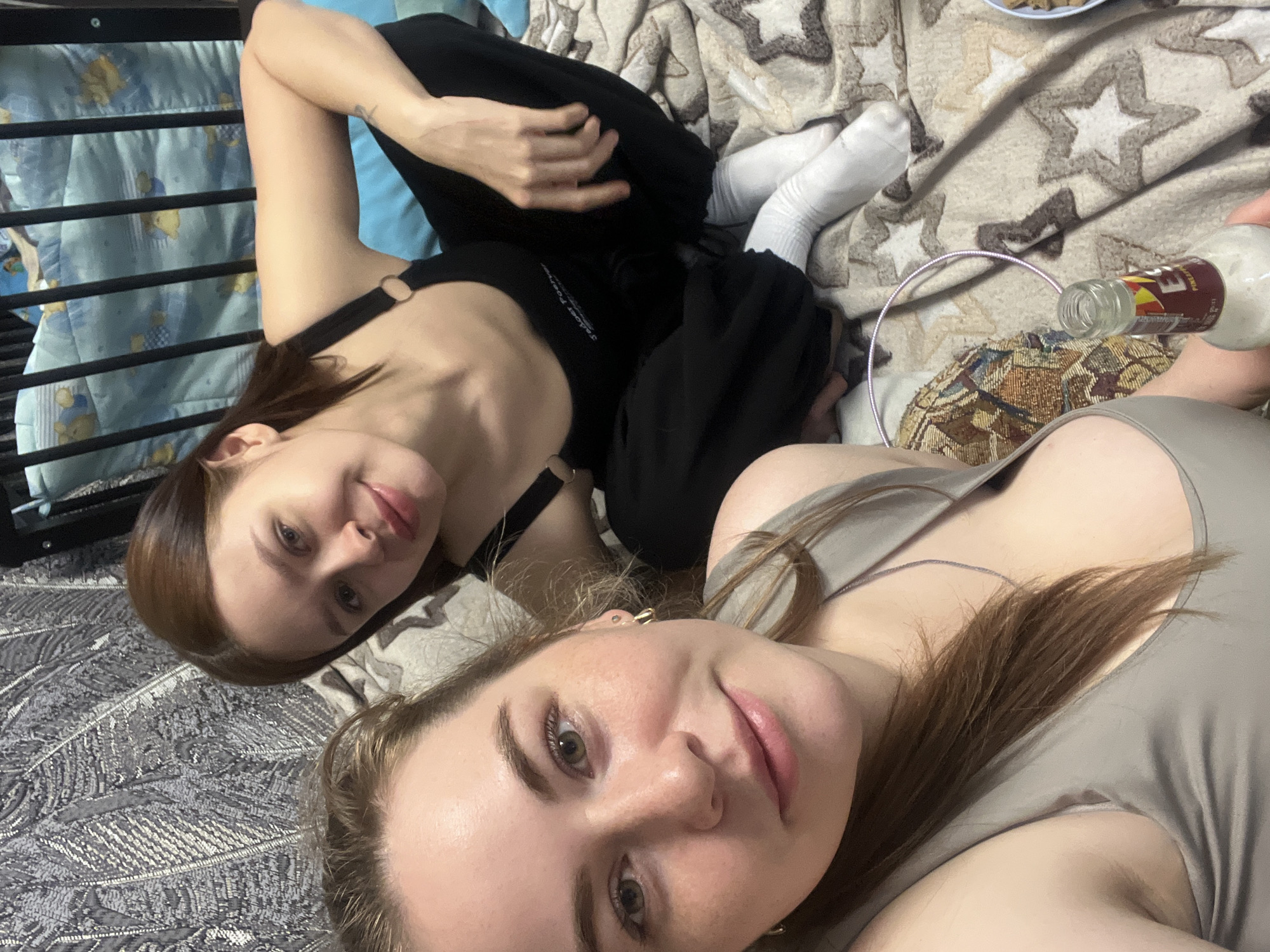 This image, taken in Chaikovsky, Russia, depicts two young adult females in a casual indoor setting. The woman in the foreground on the left has light brown hair, fair skin with freckles, and light-colored eyes; she wears a light grey sleeveless top and a silver-colored chain. She holds a clear glass bottle containing a white liquid with a "PINEAPPLE" label. The woman in the background on the right has darker brown hair, fair skin, and light-colored eyes; she wears a black sleeveless top with ring-shaped straps, black pants, and white socks, with a small dark tattoo visible on her left forearm. Both subjects are looking towards the camera with slight smiles. They are seated on a light brown blanket patterned with white stars. A small bowl of light-colored snacks is visible on the blanket to the right. Behind the woman on the right, a dark-barred crib or bed frame is visible, containing a light blue blanket patterned with yellow figures. The wall behind the subjects features a grey, textured wallpaper with a feather or leaf pattern.