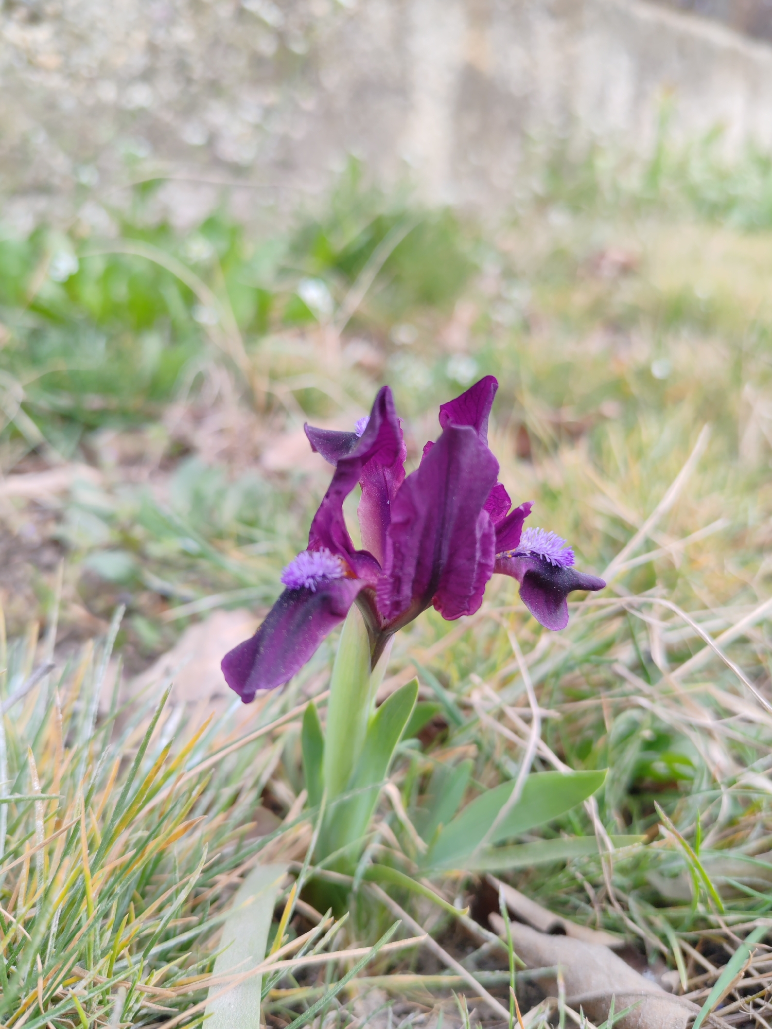 A close-up, low-angle shot captures a single, vibrant dark purple iris flower in bloom, centrally positioned within a natural, outdoor environment in Blajievo, Bulgaria. The flower exhibits three prominent falls, dark purple in color, each bearing a distinct fuzzy patch of lighter violet-purple hairs (a 'beard'). Above these, two upright dark purple standards are visible. The flower stem is green, emerging from a base surrounded by thin, blade-like green leaves. The ground cover consists of a mix of green and dry, yellowed grass blades, interspersed with some dried leaf debris. The background is softly blurred, showing indistinct patches of green and yellow vegetation, with a highly blurred, light-colored, possibly concrete or stone wall structure visible in the upper portion. No human subjects, animals, or specific actions are depicted. The scene is illuminated by ambient daylight.