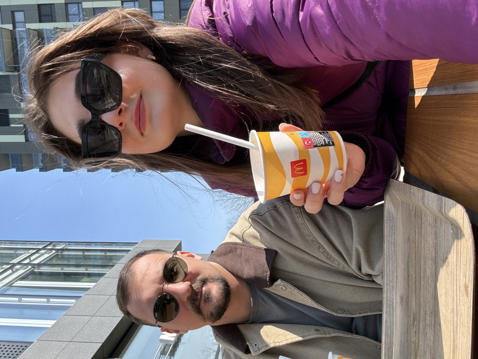 Two individuals are seated outdoors at a table in Bratislava, Slovakia, under a clear blue sky. The male, positioned on the left, has dark hair, a beard, and wears round, dark-lensed sunglasses with a thin metal frame. He is dressed in a light brown jacket with a darker brown collar over a grey t-shirt. The female, on the right, has long dark hair, wears large black square-frame sunglasses, and a purple puffer jacket. She holds a white and yellow McDonald's branded paper cup containing a white straw. A light-colored wooden tray rests on a wooden table surface in the foreground. In the background, modern urban architecture is visible, including a building with a reflective glass facade and another multi-story structure with a darker, paneled exterior. Bare tree branches are partially visible on the right. Both individuals are looking directly towards the camera.