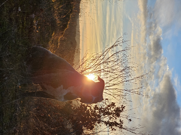 A dog, silhouetted against a vibrant sunset, stands in a field. The sun, positioned behind the dog's head, creates a halo effect. Bare branches reach into a sky filled with light clouds tinged with colors of the setting sun. The foreground contains foliage and grass, while the background reveals a landscape of land or hills in the distance.