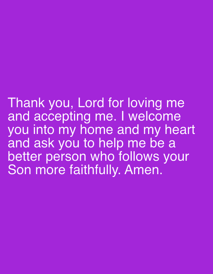 The image displays white, left-aligned sans-serif text on a solid purple background. The text, positioned in the lower half of the frame, reads: "Thank you, Lord for loving me and accepting me. I welcome you into my home and my heart and ask you to help me be a better person who follows your Son more faithfully. Amen." No individuals, actions, interactions, or additional objects are depicted within the scene. The environment is entirely a monochromatic purple field. The location is Unknown, Unknown.