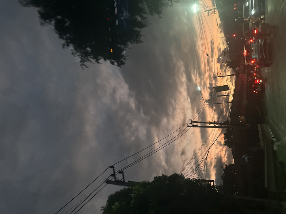 The image presents an urban street scene at dusk, captured from within a vehicle in Chiang Mai City Municipality, Thailand. The sky features dark, heavy clouds across the top half, transitioning to a distinct band of orange and pink light near the horizon, indicative of sunset. Numerous utility poles with extensive, tangled overhead power lines are prominent, crisscrossing the frame. The roadway in the foreground appears wet, reflecting ambient light. Multiple vehicles, including cars and motorcycles, are observed in traffic, appearing either stationary or moving slowly, with their red taillights illuminated. A light-colored SUV is visible in the mid-ground. Streetlights are active, with one on the right emitting a bright greenish-white light. Dark building silhouettes are discernible in the background, along with a partial view of a bridge or overpass structure. Dense green tree foliage flanks both the left and right sides of the road. A blue circular road sign is partially visible on the left. No specific individuals are clearly identifiable.