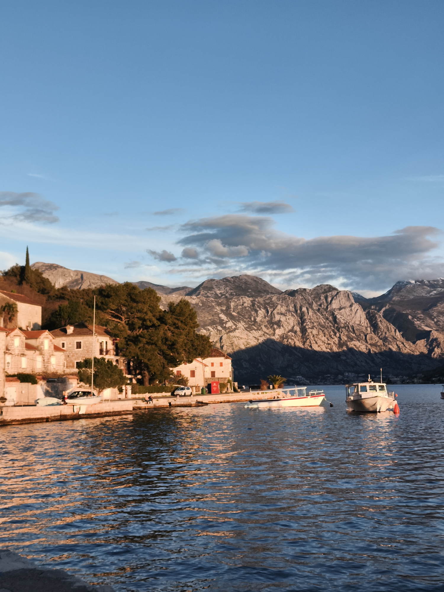 waterfront scene in an unknown city. The foreground features the Adriatic Sea, with two small motorboats anchored in the water. The light suggests it is either sunrise or sunset. Along the shoreline, there are several stone buildings with red-tiled roofs. Trees are visible between and behind the buildings. A few cars are parked along the waterfront. In the background, there are mountains with visible shadows. The sky is a mix of blue and clouds.