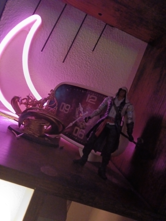 The image displays an indoor scene illuminated by a dominant pink and purple light source. On a dark, polished wooden shelf, an action figure resembling Ezio Auditore from the Assassin's Creed series stands upright, wearing a white hooded outfit and holding a staff. To the figure's left, a white-framed clock with a dark face and visible numbers "06," "09," and "12" is present. Adjacent to the clock on the left is an intricate, golden-colored metallic sculpture, possibly depicting a coiled form or a stylized ship. Behind these objects, a bright pink neon light in the shape of a crescent moon is affixed to a textured, light-colored wall, which also features several thin, dark vertical lines. The exact location within the city of Toulouse, France, is not visually identifiable from the provided image.