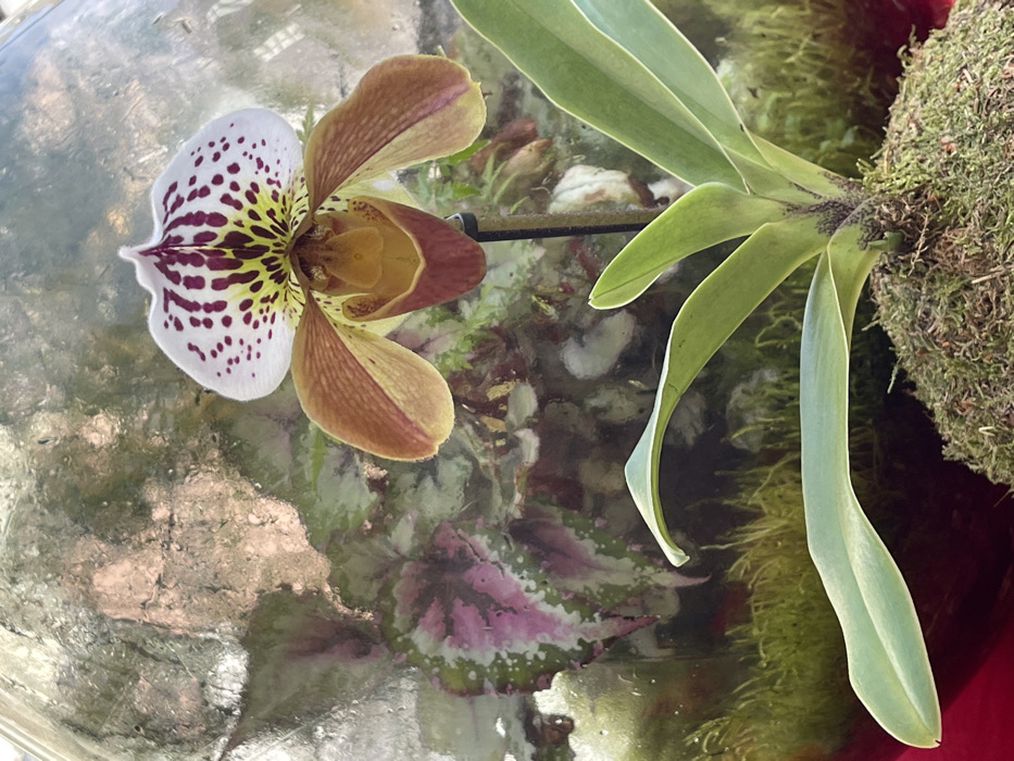 A Paphiopedilum orchid, commonly known as a slipper orchid, is centrally displayed within a clear glass terrarium or cloche