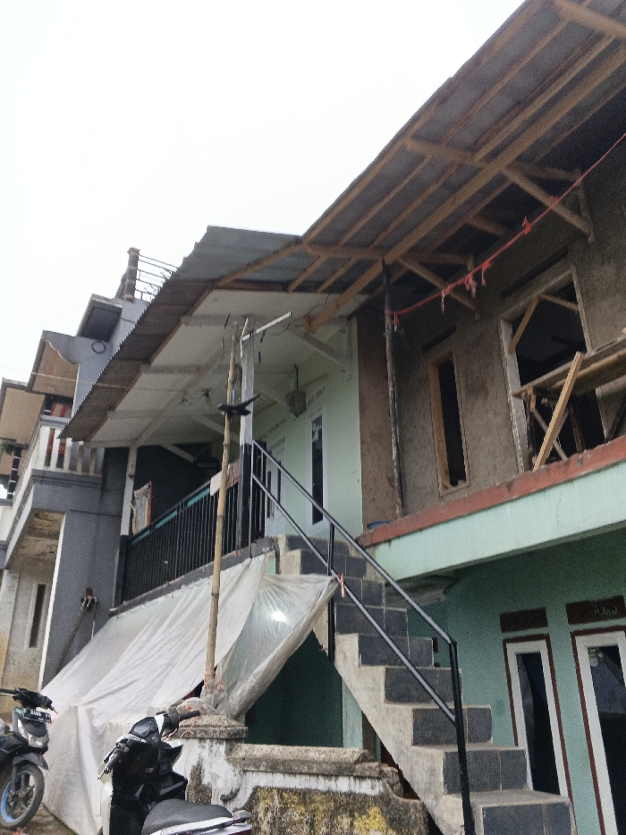 This image depicts a street-level view of multi-story residential or mixed-use buildings in Kampong Chhnang, Cambodia, under an overcast sky. The scene primarily features structures in various stages of completion or renovation. On the right, a building section displays an exposed wooden rafter roof structure covered with corrugated metal sheeting. Below, the upper facade consists of unfinished concrete with two open, unglazed rectangular window or door frames. The lower portion of this building is painted light green, featuring two white-framed doors or windows. Centrally positioned, a concrete staircase with dark grey tiles and black metal railings ascends to an upper level. This upper level has a light green painted exterior, a white door, and a black metal balcony railing. Below this upper level, a temporary awning made of white tarp is supported by a tall bamboo pole and other visible fixtures; a light source illuminates its underside. To the far left, a grey-painted multi-story building is partially visible, featuring a balcony with black railings and a decorative architectural detail on its upper facade. In the lower-left foreground, two dark-colored motorcycles are parked on the ground. Additional construction materials, including wooden planks and red ropes, are visible near the unfinished structures on the right. No individuals are present in the scene, and no specific actions or interactions are occurring.