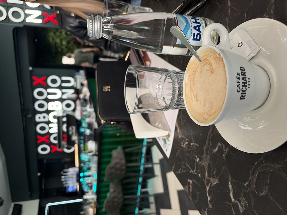 The image depicts an indoor scene within a modern cafe or bar located in Ruse, Bulgaria. In the immediate foreground, a white ceramic cup from "CAFÉS RICHARD 1892" containing a light brown frothy beverage, likely coffee, with a silver spoon resting in it, sits on a matching white saucer. A small white paper sugar packet is also on the saucer. The table surface is dark, with a white marble-like pattern. Adjacent to the coffee setup, an empty clear glass with a textured base is present. To its right, a clear glass bottle of "БАНКЯ" (Bankya) mineral water with a silver screw cap stands upright. Behind the glass, a chrome napkin holder containing white paper napkins is visible. A black leather-like handbag, adorned with a gold-colored emblem, rests on the table behind the glass and napkin holder. Partially visible to the right of the handbag is the left shoulder and long, light-colored hair of a person, who is wearing a black leather jacket. The background is an out-of-focus interior. A long bar counter with a dark green, ribbed front and a darker countertop stretches across the scene. Various bottles and glasses on the bar are illuminated by bright, teal-blue lighting. Several dark grey upholstered bar stools with dark legs are positioned in front of the counter. On the wall behind the bar, large illuminated letters form a decorative pattern, including white and red 'X' characters, spelling out sequences such as "OXOBOO X", "XONOB X", and "ONU". Further in the background, a blurry figure of a person in a dark t-shirt and dark pants is seen walking away, towards an area with visible green foliage. The floor in the background displays a geometric pattern of dark and light tiles.