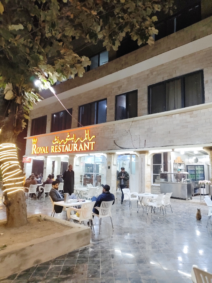 The image depicts the exterior of "Royal Restaurant" at night in the Blue Area, Pakistan