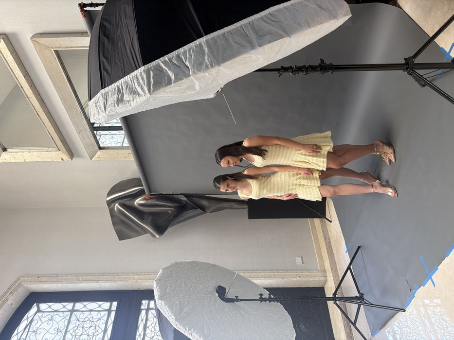 The specific location within Monterrey, Mexico, is not visually discernible from the image. The scene depicts an indoor photography session set up in an ornate room. Two young females stand on a seamless grey backdrop that extends from the wall to the patterned light-colored tile floor, secured with blue tape. Both females wear identical or very similar pale yellow, sleeveless, knee-length dresses with a horizontally ribbed texture and ruffled hems. The female on the left wears silver strappy high heels and looks slightly to her left. The female on the right wears studded nude-toned high heels and looks towards the female on the left with a subtle smile. Professional photography equipment frames the subjects: a large round softbox on a stand is positioned to the left, and a large rectangular strip softbox on a stand is positioned to the right. In the background, behind the grey backdrop and to the left, a large, dark, abstract metallic sculpture is displayed on a pedestal. Above the backdrop, on a light-colored wall, two framed mirrors with distressed gold-toned frames are mounted. To the far left, a tall, dark-framed arched window with intricate white grilles is visible, suggesting an exterior view.