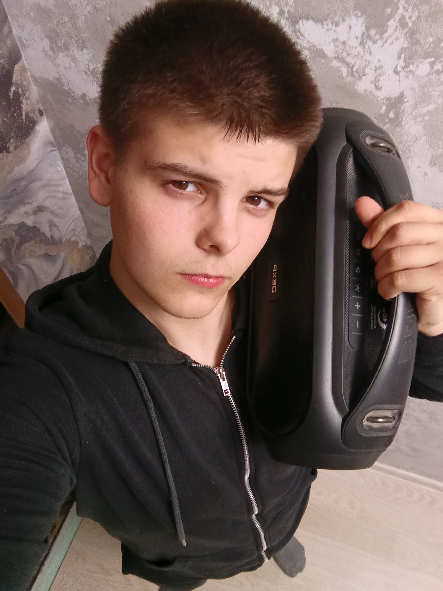 A young male is depicted in a close-up, upward-angle photograph taken indoors. He has short brown hair and brown eyes, looking directly at the camera with a neutral to slightly serious expression. He wears a black hooded sweatshirt with a partially unzipped silver zipper. His left hand grips a black DEXP portable speaker, which is held against his left shoulder/ear area. The speaker features a handle and a control panel with buttons for volume, mode, and playback. The background consists of a light-colored wall exhibiting textured or peeling paint/wallpaper. A light wooden laminate floor is visible in the lower right, with a gray sock on the subject's left foot partially visible. A vertical wooden object is partially seen on the far left. The specific location within Andreyevo, Russia, is not discernible from the visual information presented.