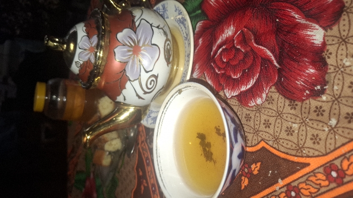 The scene is an indoor tabletop in Fergana City, Uzbekistan, depicted under dim lighting. A decorative ceramic teapot, primarily white with a reddish-brown top section, gold accents, and a purple-white floral pattern with dark scrollwork, sits on a small white saucer with blue patterns in the central-right foreground. To its left, a white piala (tea bowl) with a blue and white patterned rim contains a yellow-amber liquid with dark tea leaves settled at the bottom. In the background, a clear jar with a yellow lid holds an amber-colored substance, likely honey. To the left of the jar, several light-colored baked goods or sweets are visible on a clear plate. The objects rest on a patterned textile surface featuring a large red floral design on the right and a brown section with geometric patterns and orange borders on the left. Small white specks are scattered across the textile surface. No individuals are present.