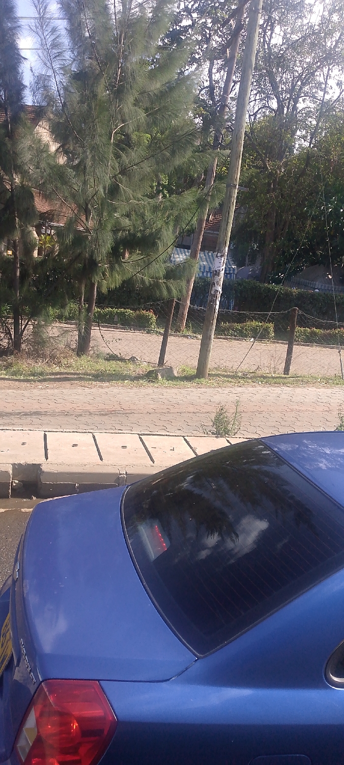 A blue Chevrolet sedan is parked on the side of a paved road in Nairobi, Kenya. The vehicle is observed from its rear passenger side, with the partial inscription "CHEVROLET" visible on the trunk lid. Reflections of overhead trees and the sky are visible on the car's rear windshield. Adjacent to the car is a concrete curb and an open drainage channel. Beyond this, the ground is paved with interlocking bricks, leading to a grassy verge. Several tall, slender trees with dense, needle-like foliage line the paved area, behind which a low wire mesh fence supported by wooden posts is situated. A prominent, slightly leaning wooden utility pole, bearing remnants of faded white paper, stands among the trees, with overhead wires extending across the scene. In the background, partially obscured by the foliage, structures are visible, including one with a reddish-brown tiled roof and another with a blue and white striped awning. The scene is illuminated by natural daylight. No individuals or specific actions are discernible.
