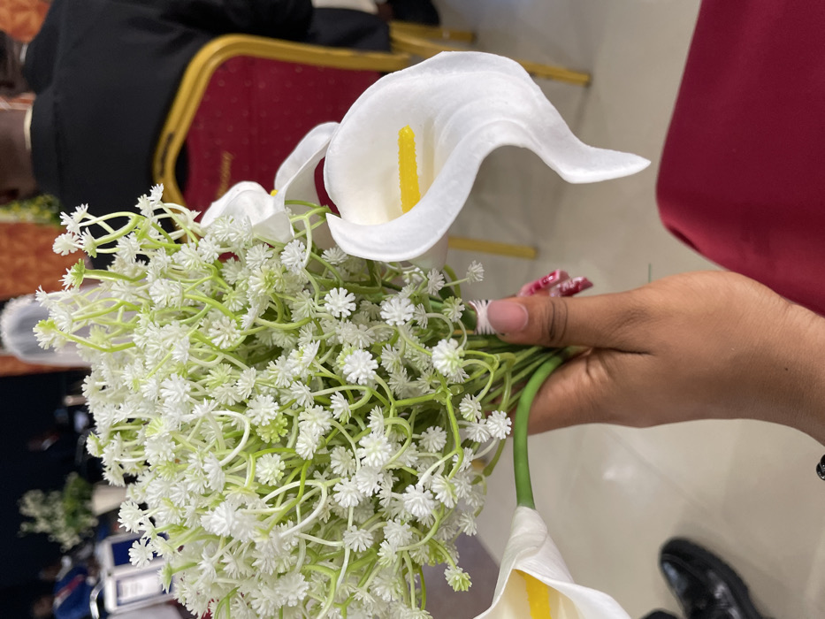 A light-brown skinned hand holds a bouquet of artificial flowers in an indoor venue in Yenegoa, Nigeria
