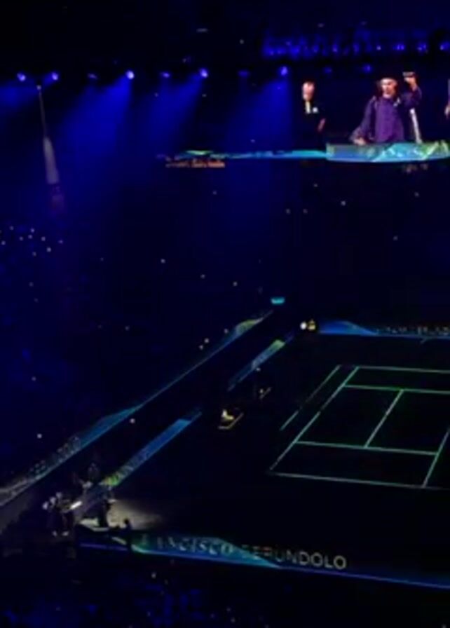 tennis court illuminated with blue and green lights. The stadium is full of spectators, most of whom are holding up their phone flashlights. The name "FRANCISCO CERUNDOLO" is projected on the court floor multiple times. A large screen displays Francisco Cerundolo in what seems to be a broadcast or promotion. White spotlights move around the arena.