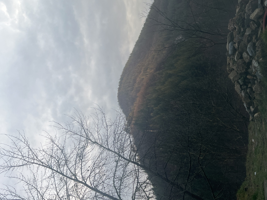 The scene depicts an outdoor landscape in Vlahovo, Bulgaria, primarily focused on a tree-covered hillside under an overcast sky. The upper half of the image is dominated by a uniform grey, cloudy sky. In the immediate foreground on the left, a large, bare deciduous tree with numerous dark, intricate branches extends diagonally upwards, partially obscuring the sky and the background hill. On the lower right, a substantial pile of various-sized, irregular grey and off-white stones rests on sparse, light green ground cover. The central lower foreground contains a darker band of dense, leafless undergrowth and smaller bare trees. Several small, white pieces of debris are scattered on the ground in this area. The midground and background are occupied by a prominent, steep hill or mountain densely covered in trees. The majority of the hill is forested with dark green coniferous trees. A distinct, diagonal strip on the upper-mid section of the hill, extending from near the peak downwards, displays trees with reddish-brown foliage, which are notably illuminated by a visible patch of sunlight. A slender, light-colored utility structure, resembling a pole or small tower, is partially visible ascending the left slope of the main hill, situated behind the foreground vegetation. No human or animal subjects are present, and no explicit actions or interactions are depicted.