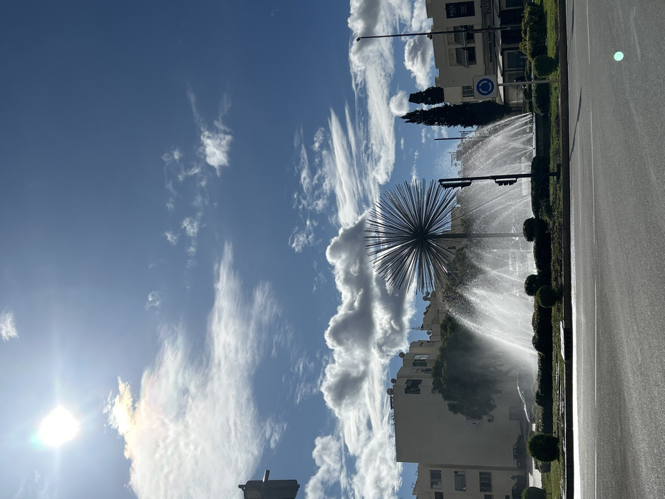 The image depicts Place de Florence (Florence Square) in Fez, Morocco, a prominent roundabout in the Ville Nouvelle. The central feature is a large, active fountain within a circular, landscaped island. At the core of the fountain, a distinctive large, spherical sculpture composed of numerous radiating metal spikes stands prominently. Water jets spray upwards and outwards from the fountain basin, creating a wide curtain of water. The roundabout island is edged with low, neatly trimmed green bushes. In the foreground, a multi-lane asphalt road, part of the circular traffic flow, is visible. To the right of the fountain, a standard blue circular road sign indicating a roundabout is visible on a pole, alongside a black traffic light pole with multiple signal heads. In the background, surrounding the square, are modern, multi-story buildings, predominantly light beige or white in color. Several buildings feature multiple satellite dishes on their rooftops. A sign for "PAUL" (a bakery chain) is visible on a building facade on the right side of the image. Scattered green trees and foliage are visible behind the fountain and between buildings. The scene is illuminated by direct sunlight, casting a bright flare in the upper left quadrant of the image. The sky is partially cloudy, with a mix of high, wispy clouds and scattered, denser cumulus formations against a clear blue background. No individuals are clearly discernible in the image.