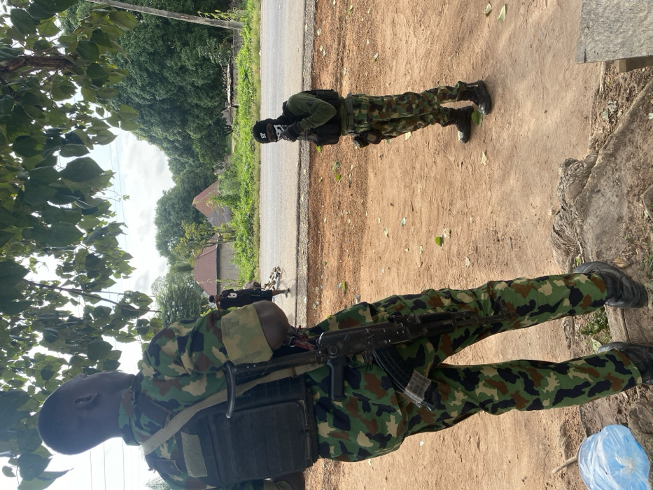Two armed individuals are standing outdoors. One soldier stands closer to the camera, brandishing a rifle, clad in camouflage gear and a dark beret. The second individual, also in camouflage, is further down a road. Both appear to be on a roadside. Trees and a glimpse of buildings are visible in the background.