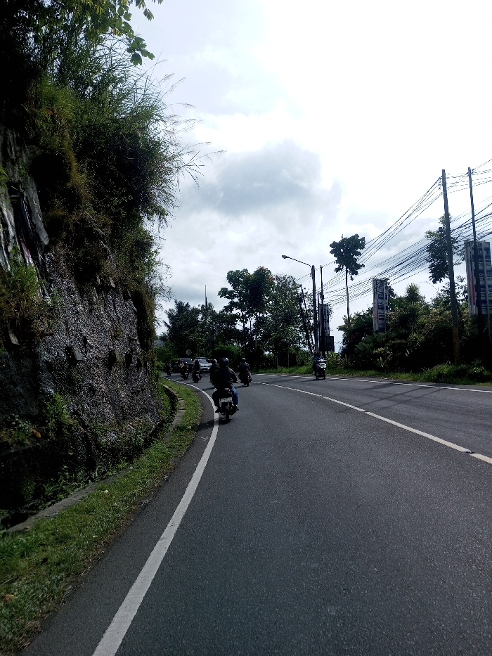 An image captured in Saing Ta Mawt Lay, Myanmar, depicts a multi-lane asphalt road curving gently to the right, observed from a low perspective. On the immediate left, a steep, dark rock embankment covered in dense green vegetation, including tall grasses and foliage, borders the road. A white solid line marks the left edge of the road, and a broken white line is visible further to the right. A procession of at least seven motorcycles, each with a single rider wearing a dark helmet and dark attire, travels away from the viewer on the left side of the road. Another motorcycle with a rider is visible further ahead on the right side of the road. A white vehicle is partially obscured among the motorcycles in the mid-ground. The right side of the road features lush green trees and dense foliage, interspersed with utility poles carrying multiple overhead power lines. Two tall, vertical billboards with light-colored panels are positioned among the trees on the right. A street lamp pole with a curved arm is also present on the right. The sky overhead is overcast with visible cloud cover.