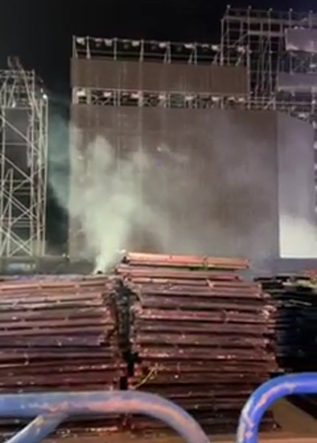 stage of an outdoor event at night. There are stacks of what appears to be wooden staging platforms in the foreground. Behind them is a large stage structure with lighting and scaffolding. A few people are standing on the stage amid fog and lights. There is a sign with the word "Heineken" on the side. The camera pans upward to focus on the stage.