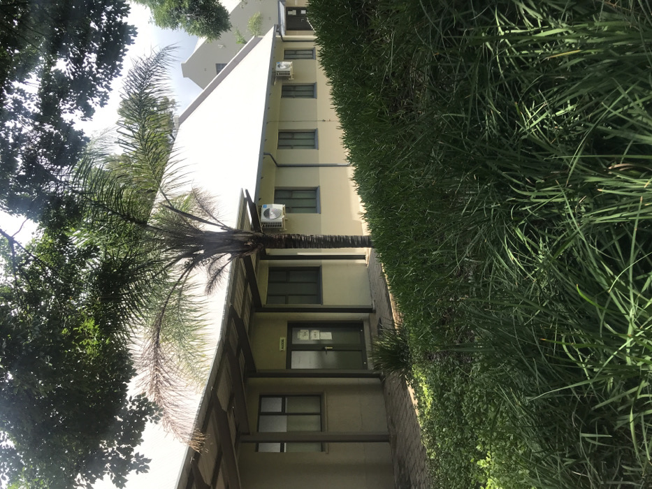 An outdoor photograph taken in Midrand, South Africa, presents a view of a single-story building section in the foreground, with a taller building structure visible behind it, under bright daylight