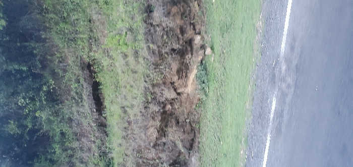 The image displays a roadside scene with dense vegetation to the left, including trees and shrubs. A steep, bare, earthen bank rises from the left. Adjacent to this is a strip of green grass leading to the edge of a dark asphalt road, demarcated by a white line. The overall impression is that of a rural area where the road cuts through a natural landscape.