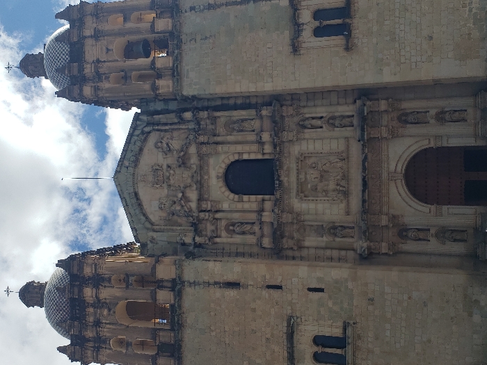 A low-angle shot shows a baroque-style church facade. The building features two bell towers, both topped with blue-and-white tiled domes and crosses. The central section showcases ornate carvings, a high arched doorway, and several small statues. Windows are visible on the bell towers and the church's facade. Stone blocks form the structural design of the building, and a cloudy sky serves as the backdrop.