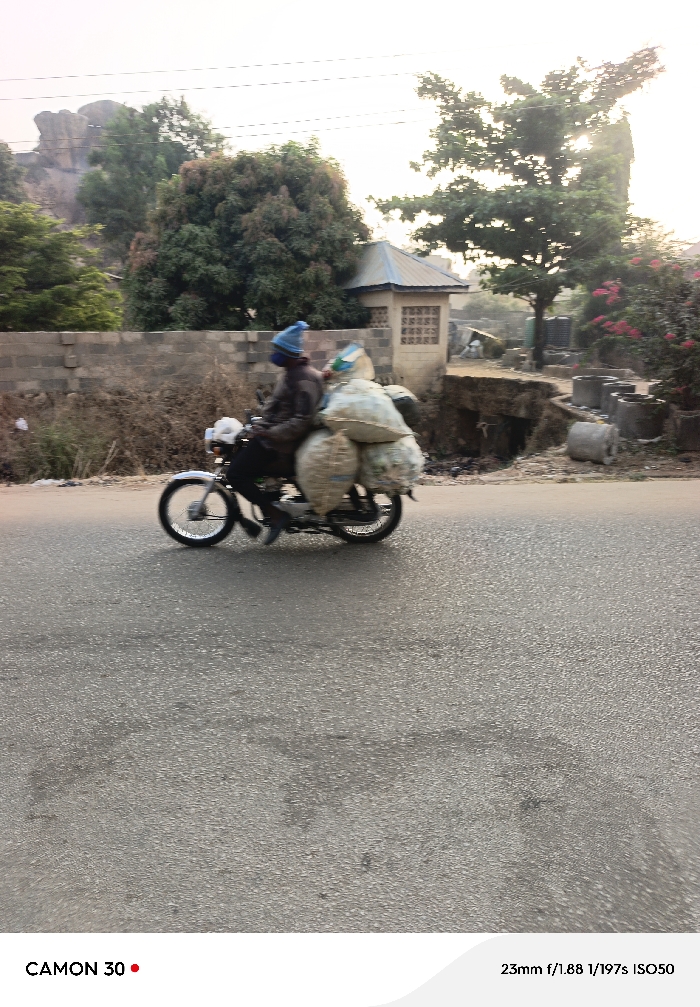 A man wearing a blue hat and a mask drives a motorcycle laden with multiple large sacks. The road is grey asphalt. Behind him is a wall, trees, and a small building with a blue roof. To the right, there are some concrete structures and pink flowering bushes. The background suggests a somewhat rural or developing area. The light is bright, possibly early morning. Camera information is printed at the bottom.