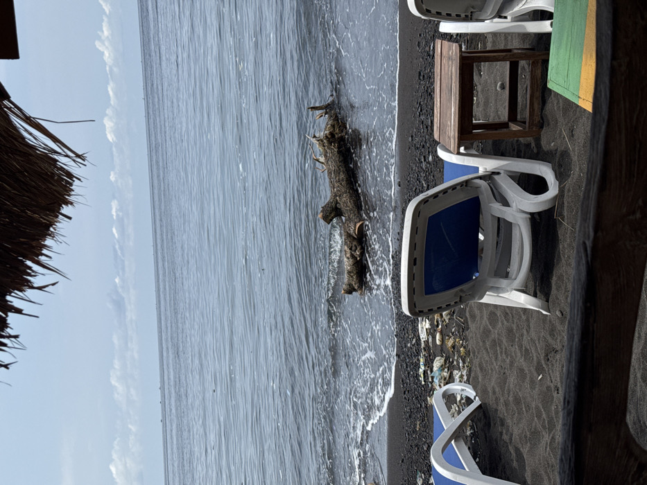 The image displays a black sand beach scene, likely located in an unknown city in Indonesia, observed from beneath a thatched roof. In the immediate foreground, a dark wooden railing crosses the bottom of the frame, partially obscuring a green and yellow object. On the dark grey sand, two white plastic sun loungers with blue fabric are positioned facing the water; one is seen from the back, and the other is partially visible to its right, separated by a small, square, dark wooden side table. The area of the beach where the sand meets the water is significantly littered with plastic debris, including bottles and bags. A large, weathered tree trunk or log is partially submerged in the shallow, dark grey-blue ocean water, with small waves breaking around it. The ocean extends to the horizon, where several small, dark, unidentifiable objects are faintly visible. The sky is overcast with scattered white clouds, appearing light blue to grey. No individuals are present.