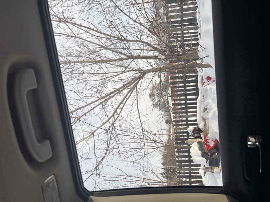 A view through a car's sunroof shows a winter scene. Bare tree branches reach across a cloudy sky. A wooden fence stands parallel to the camera, partially obscured by snow. Red objects are scattered near the fence, also covered in snow. The interior of the car is visible, including a handle and other interior details.